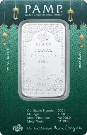 1 oz stříbrný slitek | PAMP | Eid Mubarak Objevte nadčasovou hodnotu stříbra s 1oz stříbrným slitkem | PAMP | Eid Mubarak. Tyto pečlivě vyrobené slitky z ryzího stříbra 999/1000 představují eleganci a bezpečí. Tyto 31,1035g stříbrné slitky, vyrobené jednou z nejdůvěryhodnějších rafinérií, PAMP Switzerland, jsou ideální pro investory, kteří chtějí diverzifikovat nebo rozšířit své portfolio drahých kovů. 1 oz stříbrný slitek | PAMP | Specifikace k svátku Eid Mubarak: Mincovna : PAMP Švýcarsko Kov : Stříbro (ryzost: 999/1000) Typ produktu: slitky Série: slitky PAMP Země původu: Švýcarsko hmotnost : 31,1035 g Balení produktu : Dodáváno v kartě CertiPAMP™ a dárkovém obalu pro zajištění maximální ochrany.